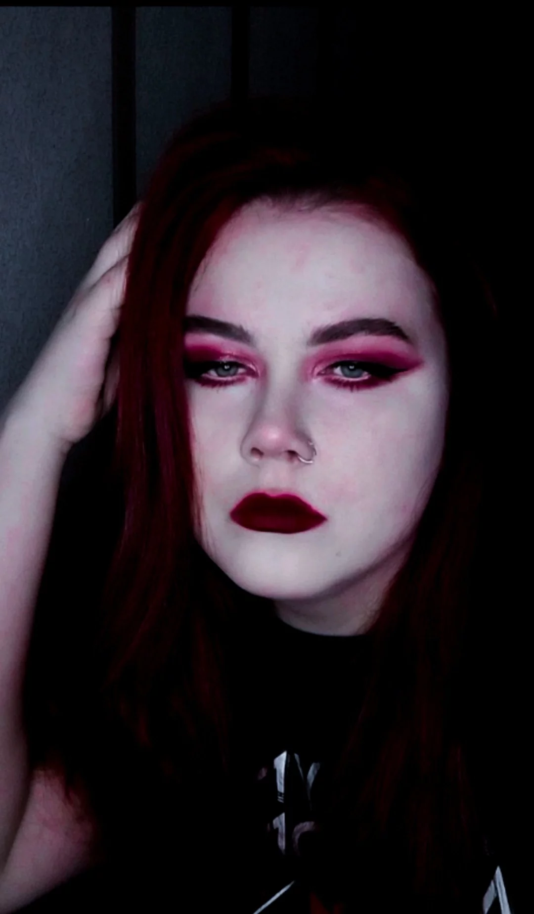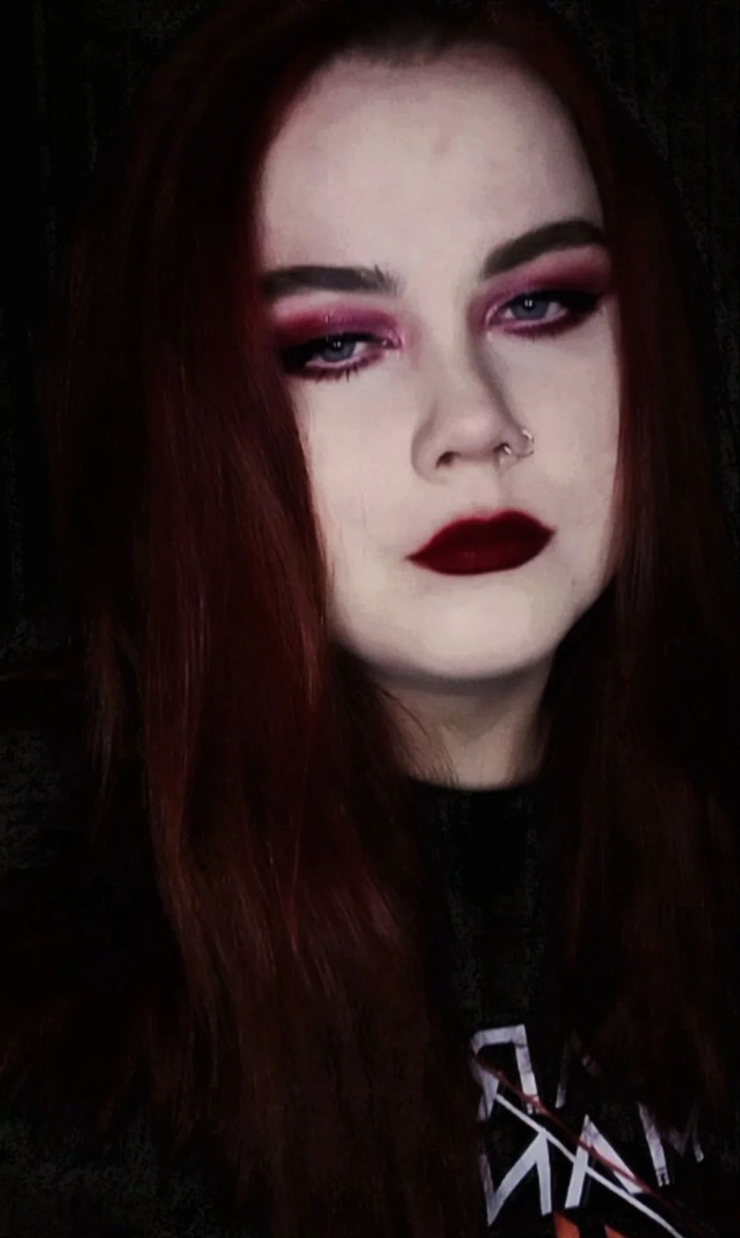 Девушка-неформалка. Имеются 3 пирсинга, в носу, под губой и в языке.