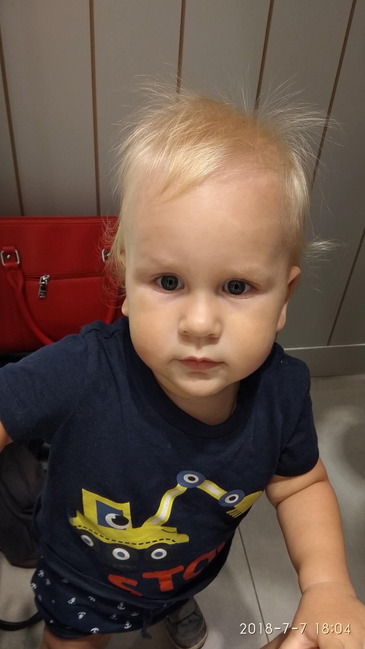 Серьезный, доброжелательный малыш. Очень сообразительный и общительный. Блондин с голубыми глазами.